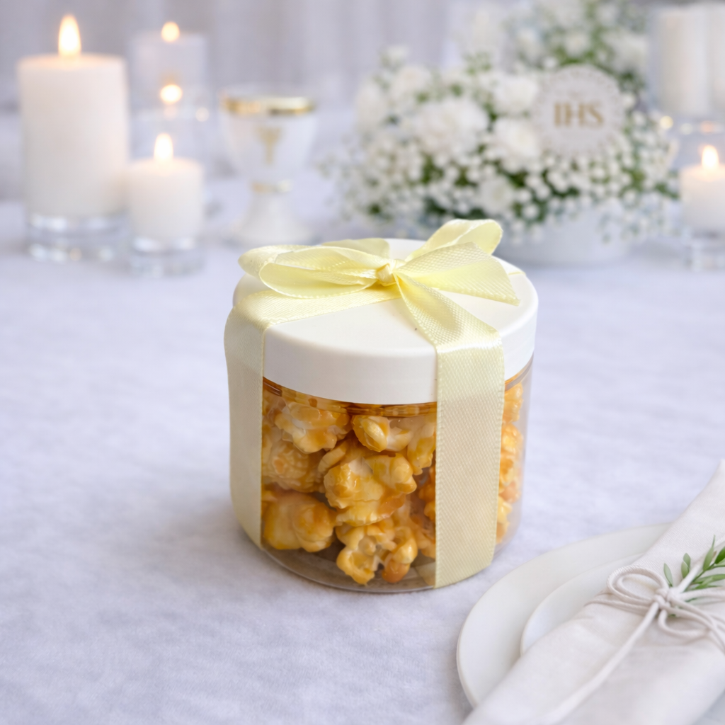 Elegancki upominek komunijny z popcornem karmelowym to wyjątkowy sposób, aby podziękować gościom za obecność w tym ważnym dniu. Estetyczne pudełeczko z kremową wstążką prezentuje się delikatnie i stylowo, idealnie wpisując się w charakter uroczystości.